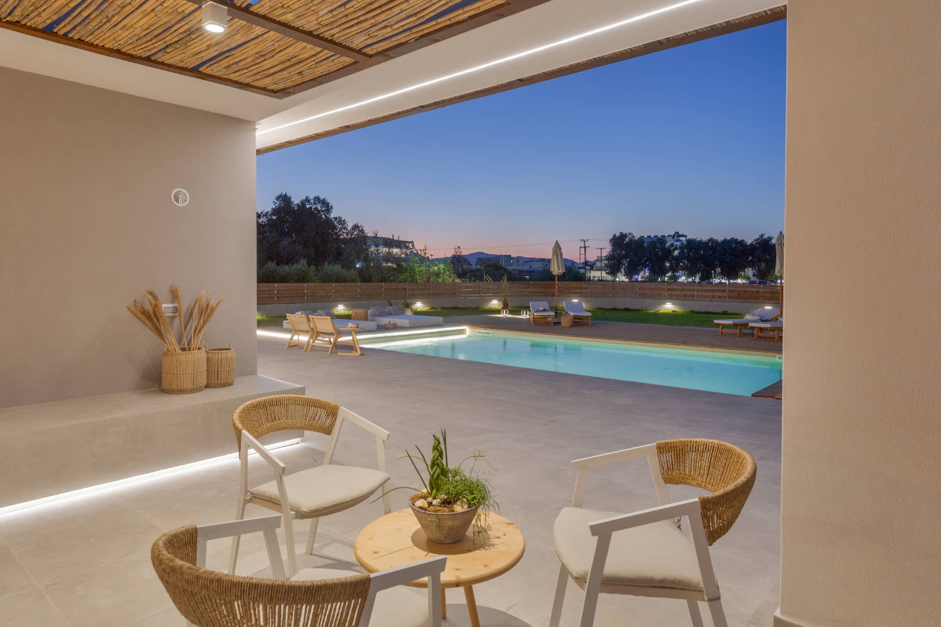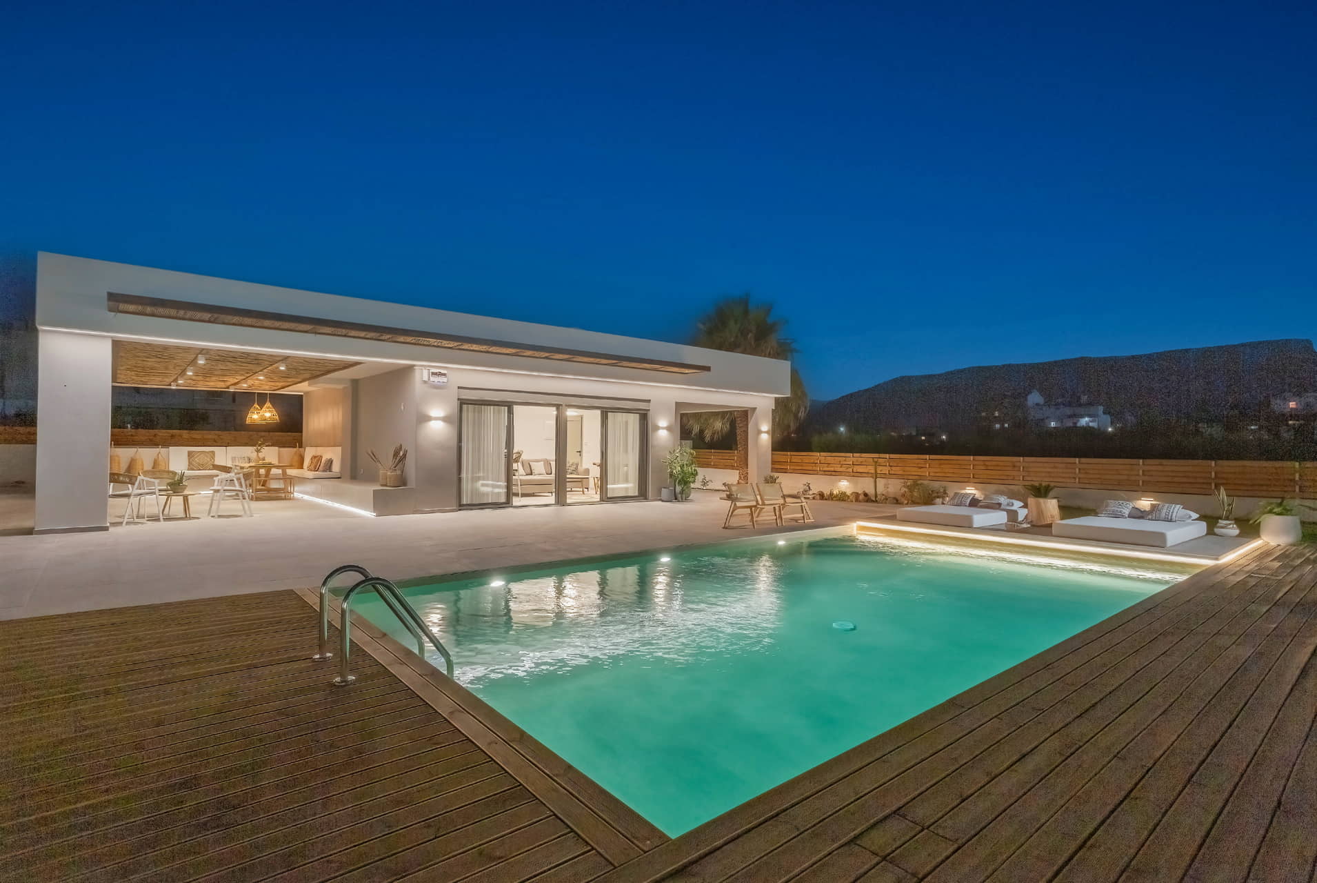 Athena Luxury Villa lies on the island’s stunning north coast, just 450 meters from one of the largest beaches on Crete, Ammoudara. It is located just 15km away from the International Airport of Heraklion, making your transfer quick and comfortable. This region provides generous outdoors and seamless views of the Mediterranean Sea, as well as an endless world of adventures, extraordinary dining & experiences to remember. The spacious villa extends to 1.300 sqm and features a modern design, with a touch of minimalism.